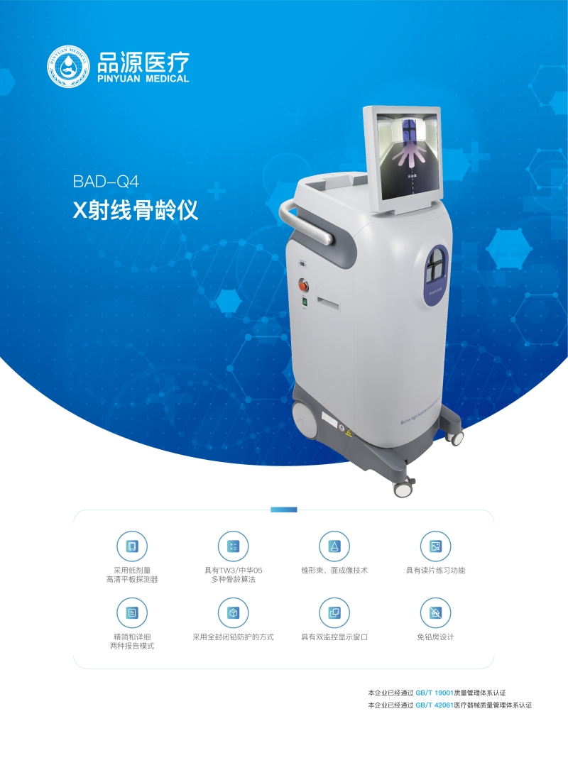 X射线骨龄仪BAD-Q4具有TW3、中华05等多种骨龄算法,结果可靠准确,采用全封闭X射线防护方式,有效遮挡X射线泄露,测量快捷、测量准确度高,使用方便,是临床医师、体育专家、司法专家等研究儿童骨龄方面的好帮手。