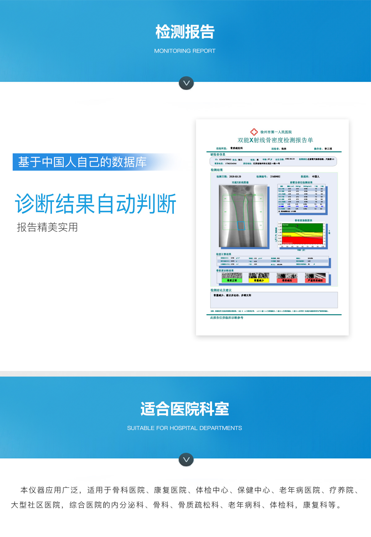 产品用途 本仪器应用广泛,适用于骨科医院、康复医院、体检中心、保健中心、老年病医院、疗养院、大型社区医院,综合医院的内分泌科、骨科、骨质疏松科、老年病科、体检科、康复科等。